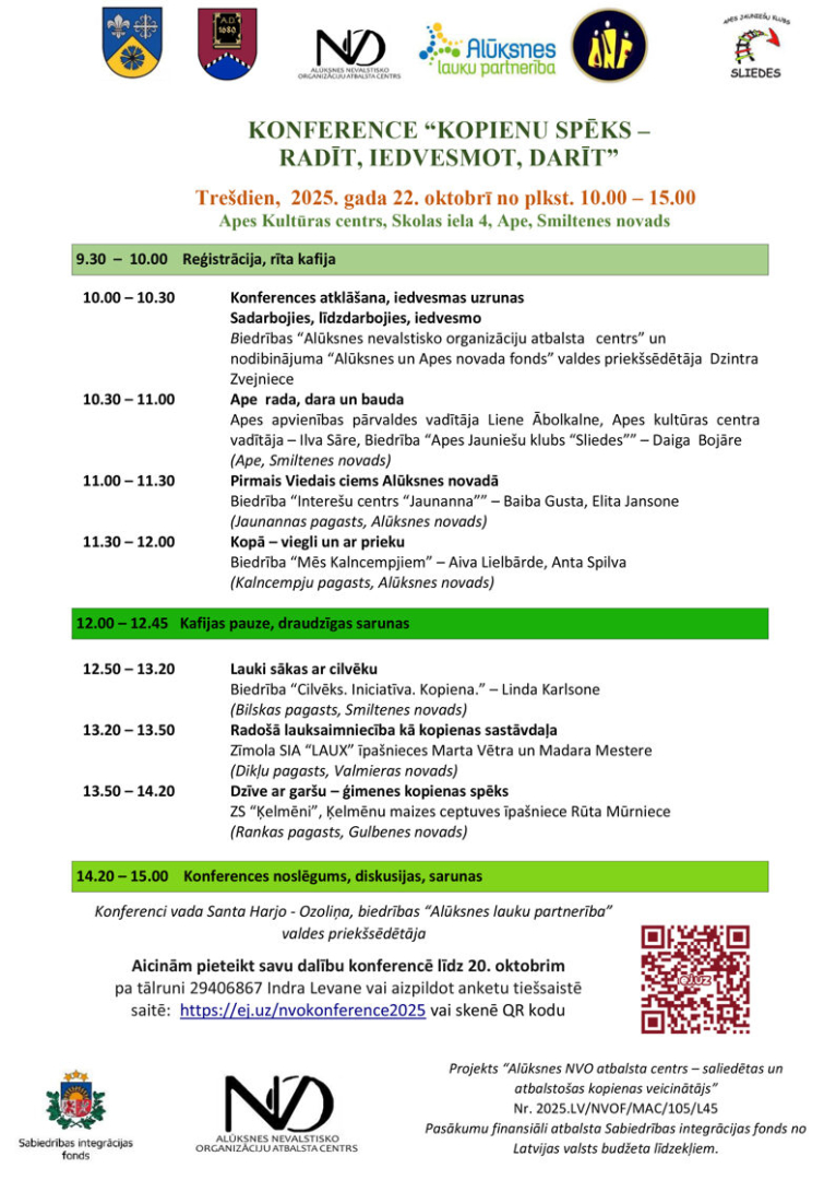 Trešdien, 2025. gada 22. oktobrī, no pulksten 10.00 līdz 15.00 Apes Kultūras centrā norisināsies konference “Kopienu spēks – radīt, iedvesmot, darīt”. Uz to aicināts ikviens interesents, kurš vēlas dalīties savā pieredzē, gūt iedvesmu un iepazīt labās prakses piemērus no dažādām Latvijas kopienām.