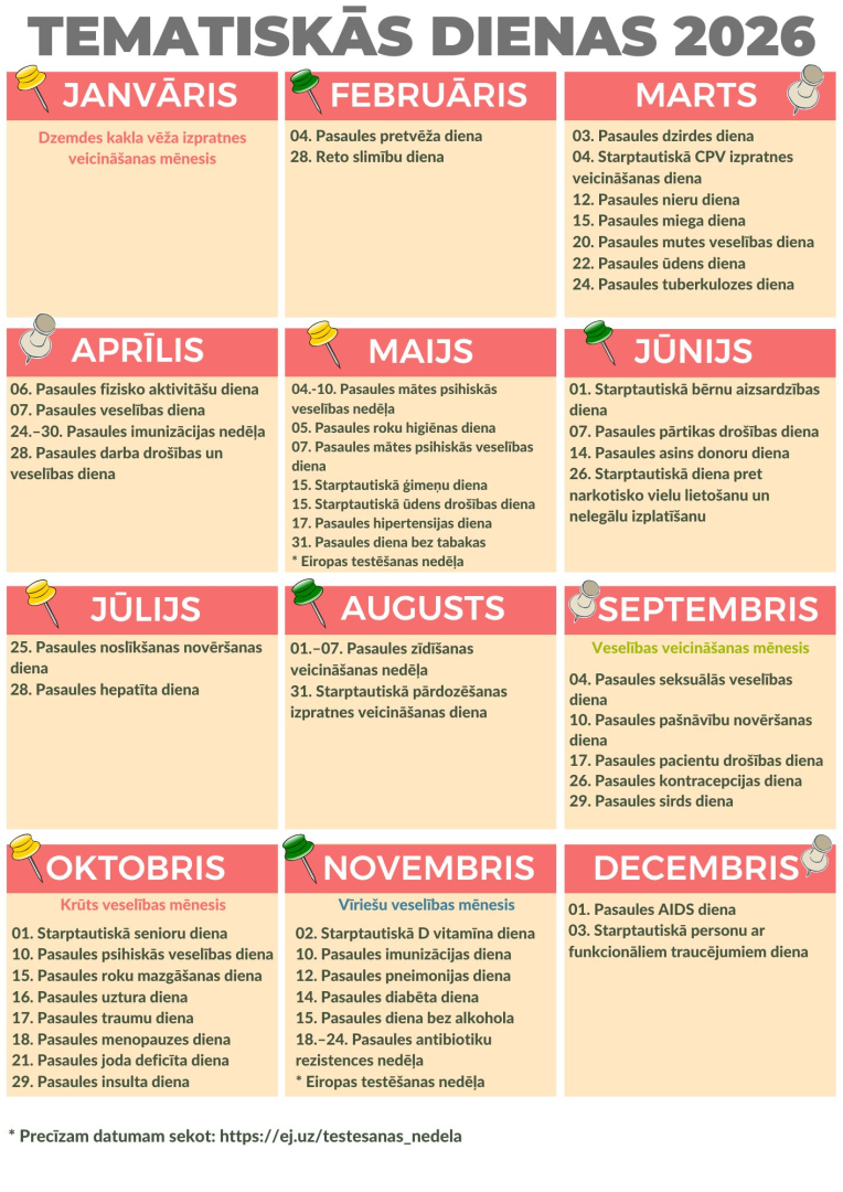 Slimību un profilakses centrs (SPKC) un Nacionālais veselīgo pašvaldību tīkls informē, ka izdots kalendārs “Tematiskās dienas 2026”, kas informē par dažādām ar veselību saistītām aktivitātēm 2026. gadā.