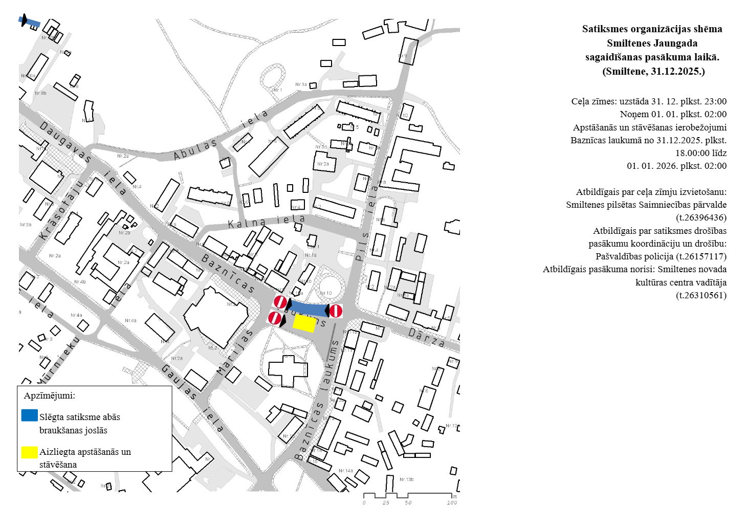 Laika posmā no 2025. gada 31. decembra pulksten 18.00 līdz 2026. gada 1. janvāra pulksten 02.00 Smiltenes pilsētas centrā, Baznīcas laukuma apkārtnē, tiks noteikti apstāšanās un stāvēšanas aizliegumi, kā arī satiksmes kustības ierobežojumi.