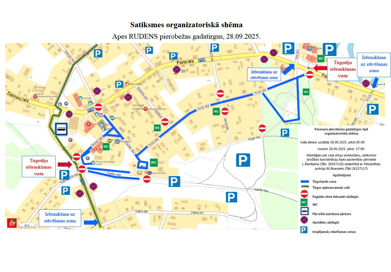 Lai nokļūtu tirgū bez aizķeršanās, aicinām novadniekus un viesus iepazīties ar satiksmes organizācijas izmaiņām. Ceļa zīmes tiks uzstādītas 28. septembrī pulksten 5.00 un noņemtas tas pašas dienas vakarā, pulksten 17.00. Atbildīgais par ceļa zīmju izvietošanu, satiksmes drošības koordināciju: