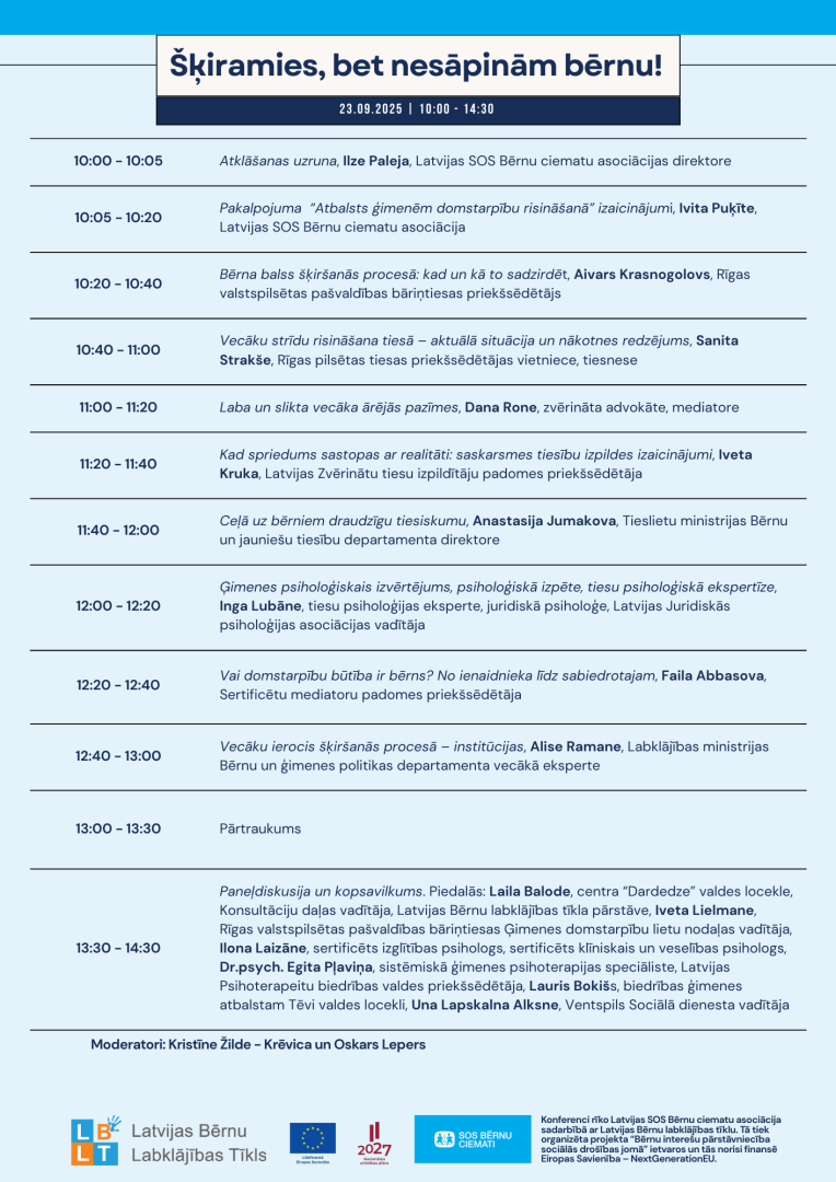 Forumam tiešsaistē sekot aicināts ikviens, kuru interesē bērnu labklājība šķiršanās procesā — vecāki, pedagogi, psihologi, juristi, sociālie darbinieki, politikas veidotāji un mediju pārstāvji.Forumā uzstāsies Ivita Puķīte no Latvijas SOS Bērnu ciematu asociācijas pakalpojuma “Atbalsts ģimenēm domstarpību risināšanā”, Rīgas valstspilsētas pašvaldības bāriņtiesas priekšsēdētājs Aivars Krasnogolovs, tiesnese Sanita Strakše, mediatore Dana Rone, Latvijas Zvērinātu tiesu izpildītāju padomes priekšsēdētāja Iveta Kruka, Tieslietu ministrijas Bērnu un jauniešu tiesību departamenta direktore Anastasija Jumakova, tiesu psiholoģijas eksperte Inga Lubāne, Sertificētu mediatoru padomes priekšsēdētāja Faila Abbasova un Labklājības ministrijas Bērnu un ģimenes politikas departamenta vecākā eksperte Alisa Ramane. Foruma noslēgumā notiks paneļdiskusija.