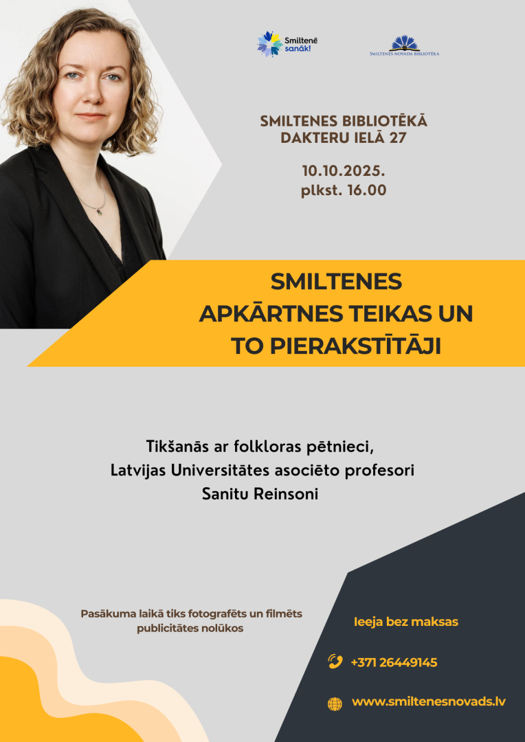 Smiltenes bibliotēka 10.oktobrī plkst. 16.00 aicina interesentus uz lekciju “Smiltenes apkārtnes teikas un to pierakstītāji”. Stāstīs un aicinās diskutēt folkloras pētniece, Latvijas Universitātes Humanitāro zinātņu fakultātes asociētā profesore Sanita Reinsone.
