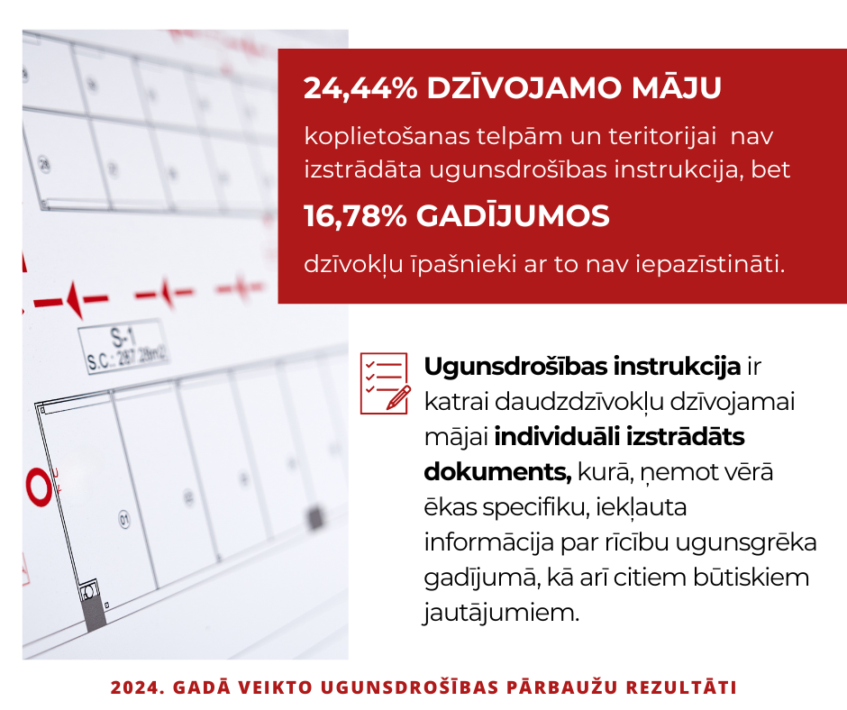 - 24,44 % gadījumos daudzdzīvokļu objekta koplietošanas telpām un teritorijai nav izstrādāta ugunsdrošības instrukcija, bet 16,78 % gadījumos dzīvokļu īpašnieki ar to nav iepazīstināti.
