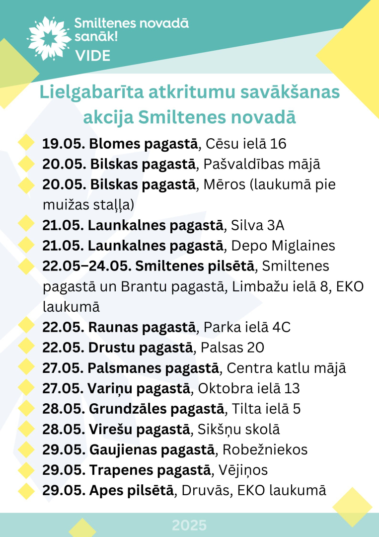 No 2025. gada 19. maija Smiltenes novada pašvaldība sadarbībā ar SIA “ZAAO” organizē ikgadējo lielgabarīta atkritumu savākšanas akciju. Tās mērķis ir samazināt nelegāli vidē nonākušo atkritumu apjomu un atbalstīt novada iedzīvotājus īpašumu sakārtošanā.