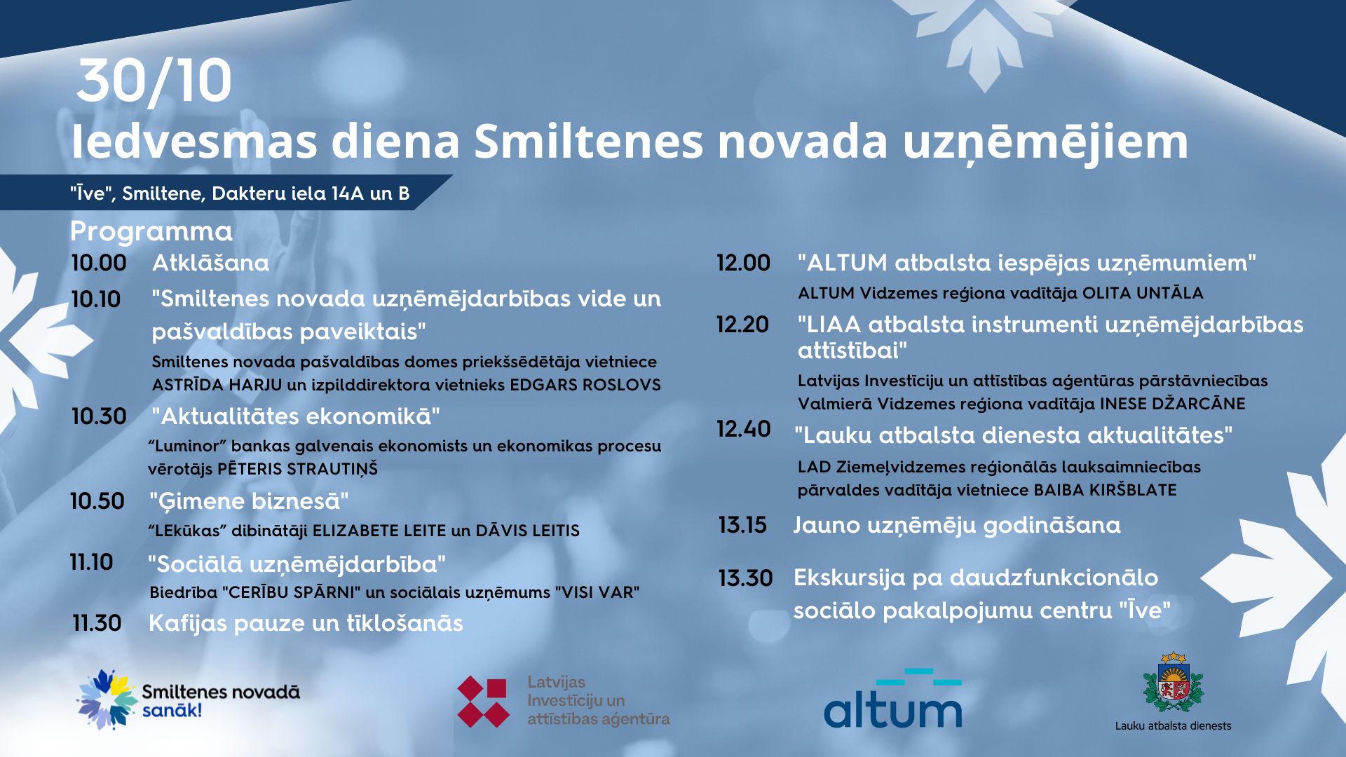 Smiltenes novada pašvaldība jau ceturto gadu aicina esošos, jaunos un topošos uzņēmējus uz pasākumu “Iedvesmas diena Smiltenes novada uzņēmējiem”, kas šogad notiks 30. oktobrī Vidzemē lielākajā daudzfunkcionālajā sociālo pakalpojumu centrā “Īve” – Smiltenē, Dakteru ielā 14A un 14B. Dalība – bez maksas.