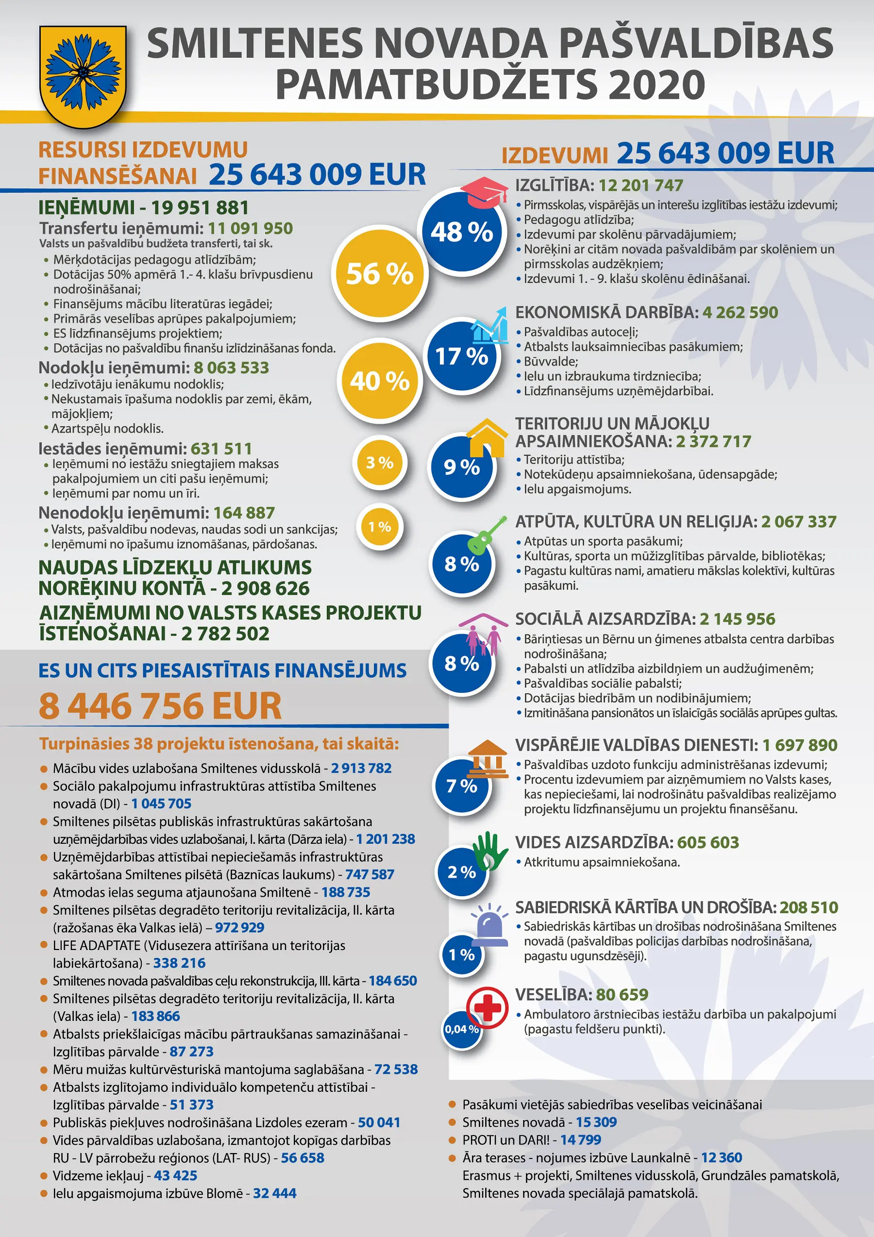 Smiltenes novada pašvaldības 2018.gada pamatbudžeta kopējie izdevumi plānoti 25 643 547 eiro apmērā. Pamatbudžeta izdevumi atbilstoši funkcionālajām kategorijām sadalīti 188 struktūrvienībās, tai skaitā 47 projekti.